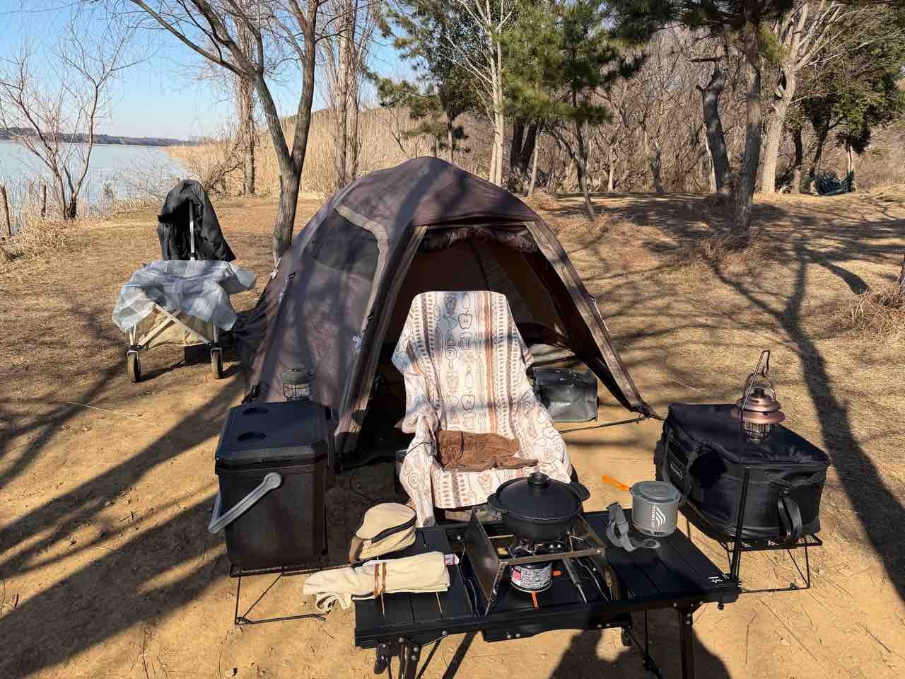 さて、設営したばかりの時間(11時前)はあまり風も吹いて無くて、暖かかった。天気良いから日差しもポカポカしててね。そうなるとやりたくなるんだよなぁ……