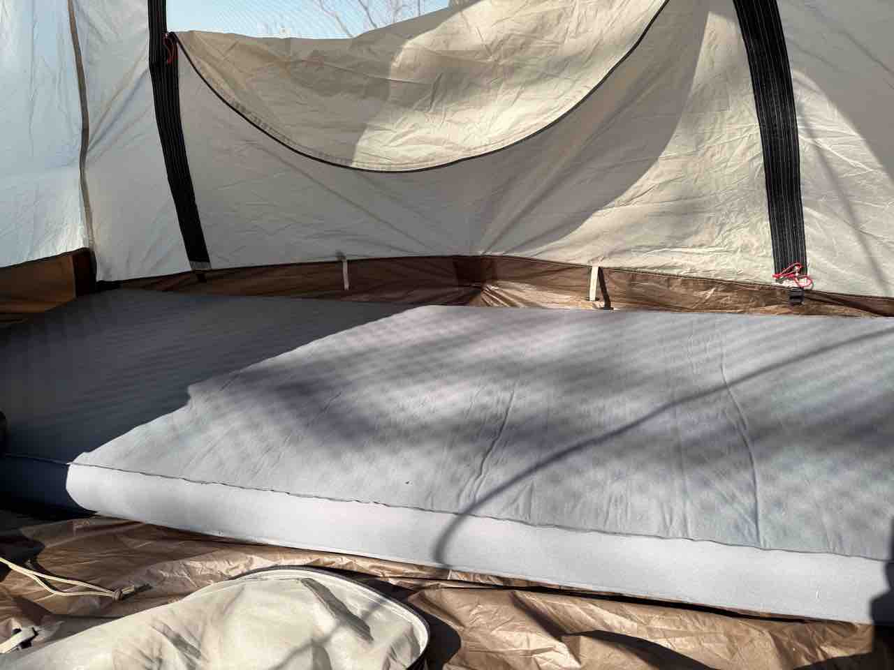 これね。電動ポンプ内蔵で、少し音はするけどスイッチ一つで膨らませてくれるし、萎ませる事もできる。インナー立てた段階で放り込んでスイッチオンで膨らんで行くから、その間は別の作業もできるし。厚さも12cmあるから地面からの冷たさは全く感じない。場所は取るけど、これは良い買い物をしたと思う。