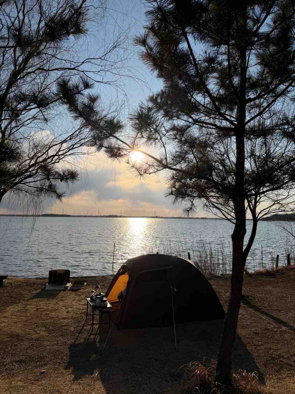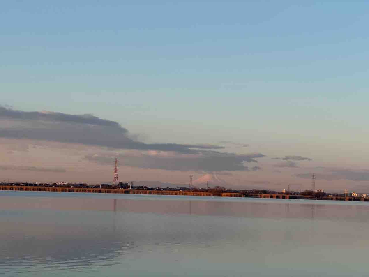 奥の雲が少し流れたら富士山もバッチリ見えた。茨城からも見れるんだなと改めて。夕日の方は皆が集まってくるけれど、朝方のこの寒い時期は人が来ないから、独り占めで見てた。寒くても、風が強くても、岸辺にテントを張るのはこういう楽しみがあるから。