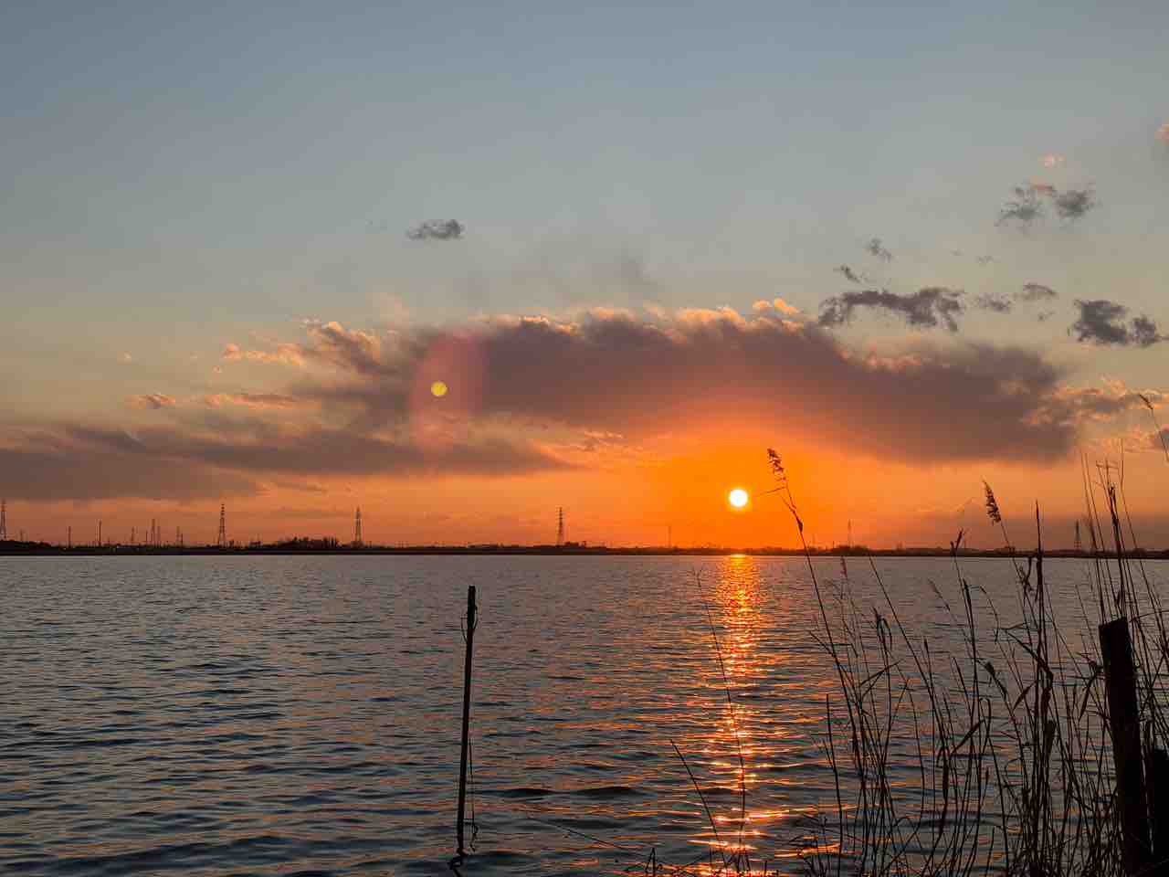 この日は夕方から曇り予報だったので諦めていたんだけど、バッチリ夕日が沈む所も観ることができた。良いよねぇ、この紅い空。それを映す水面も美しい。酒も進むというもの(笑)。