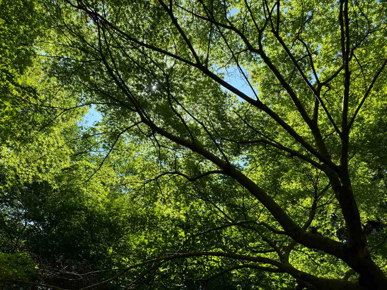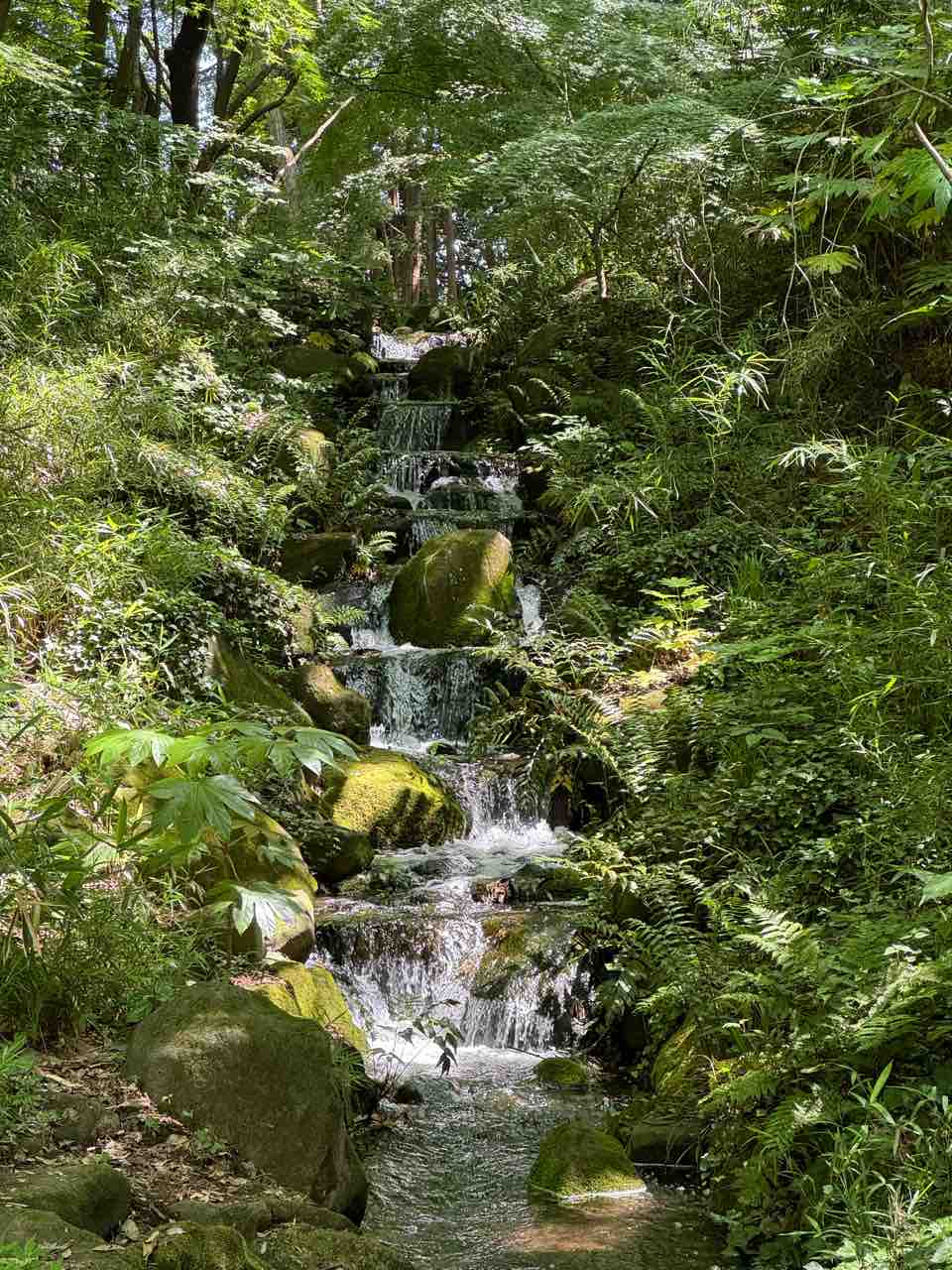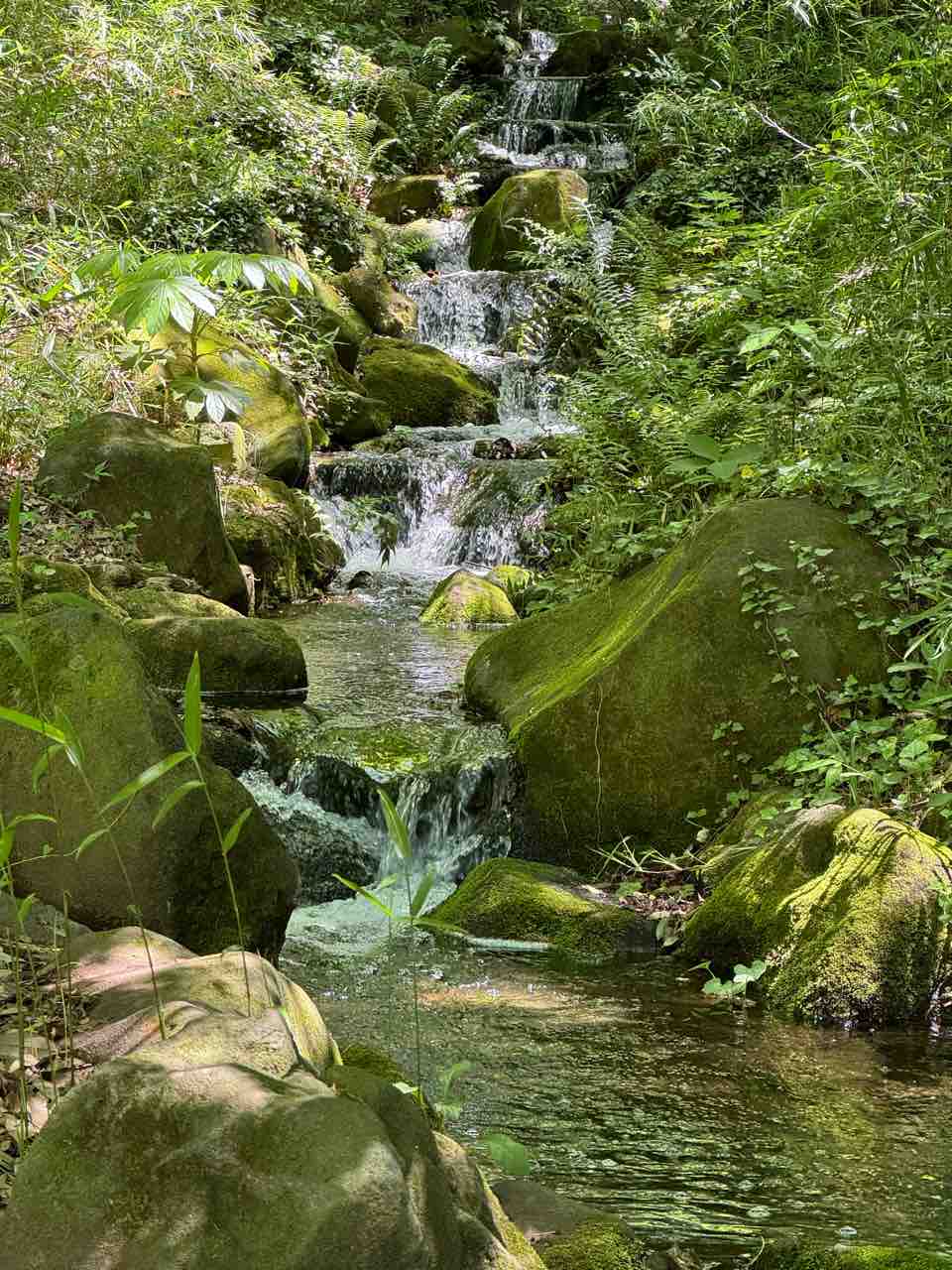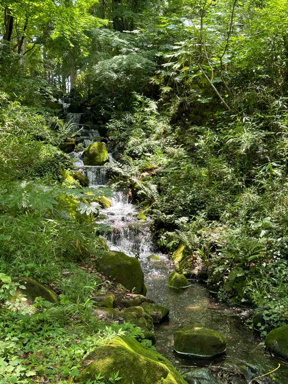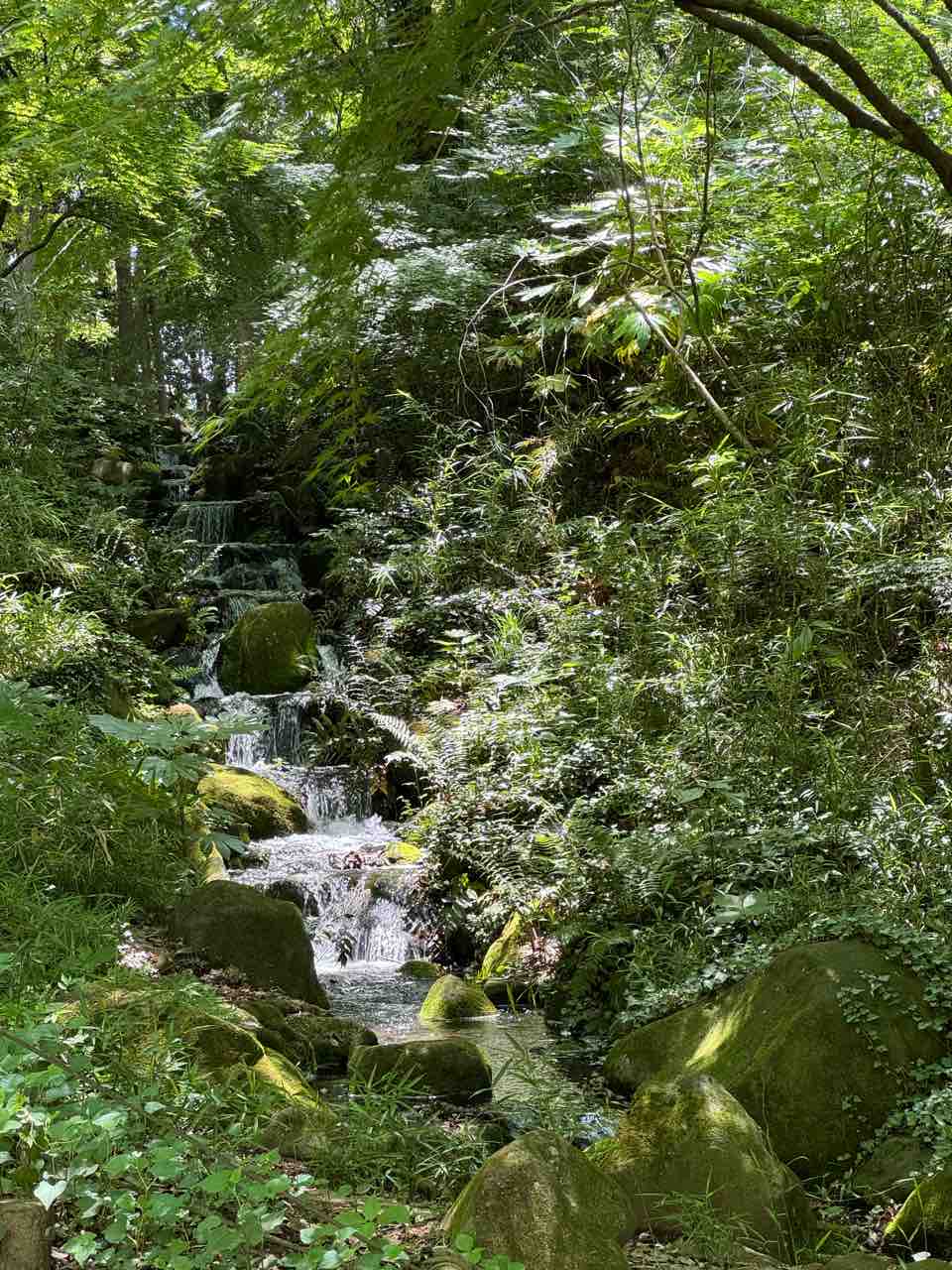 見上げれば緑。この場所、本当に良いよ。木陰で涼しくて、ミニ渓流があって、癒やしで一杯だよ。iPadで漫画読んでるだけなら家でエアコンかけての方が涼しくて良いんだろうけど、敢えてこうやって自然の中にいるってのが良いのよ。