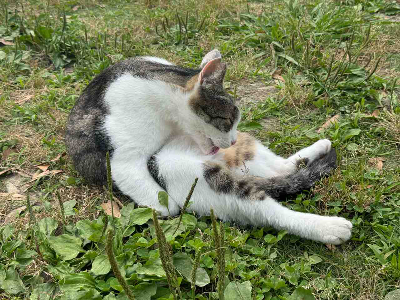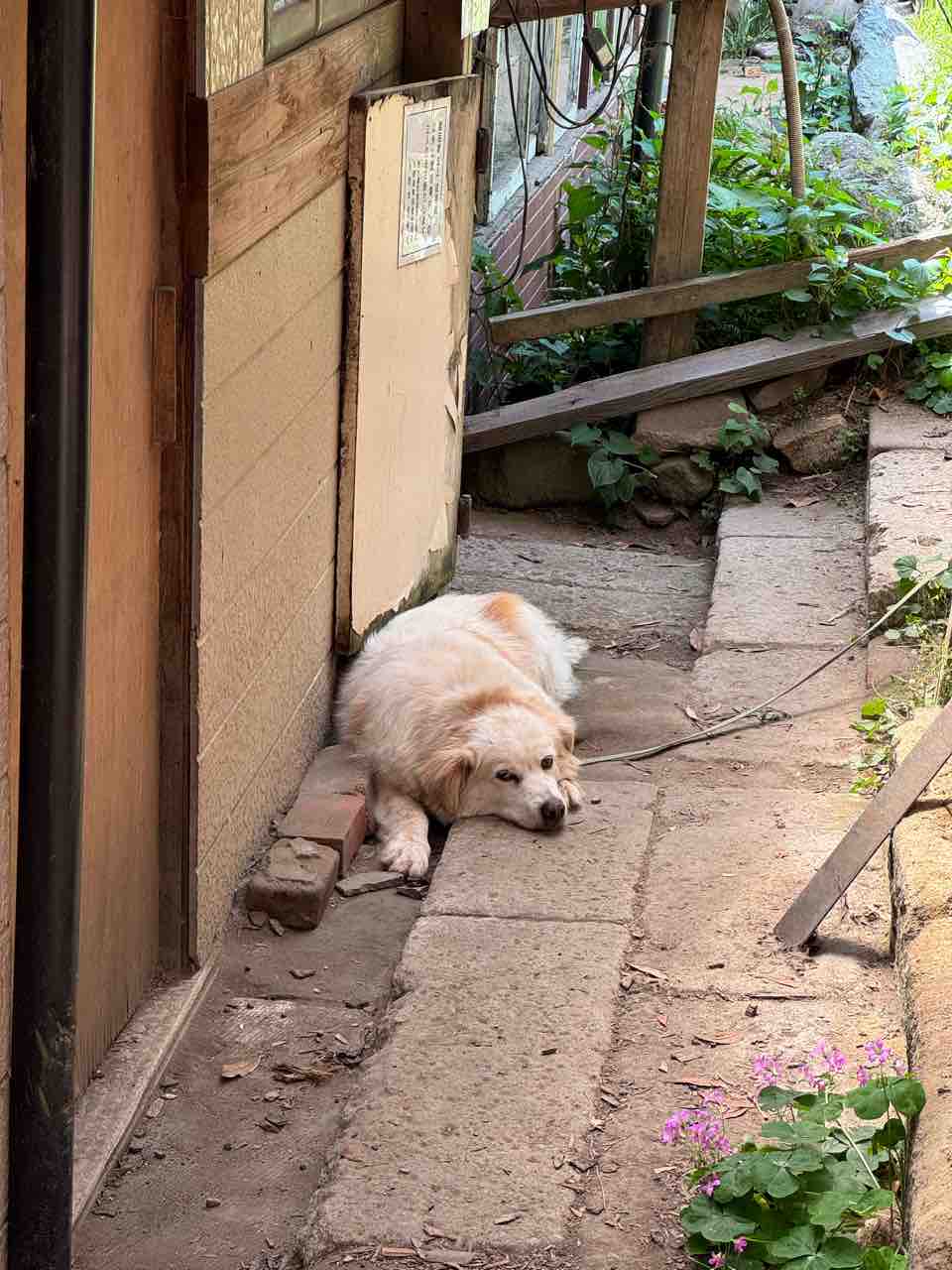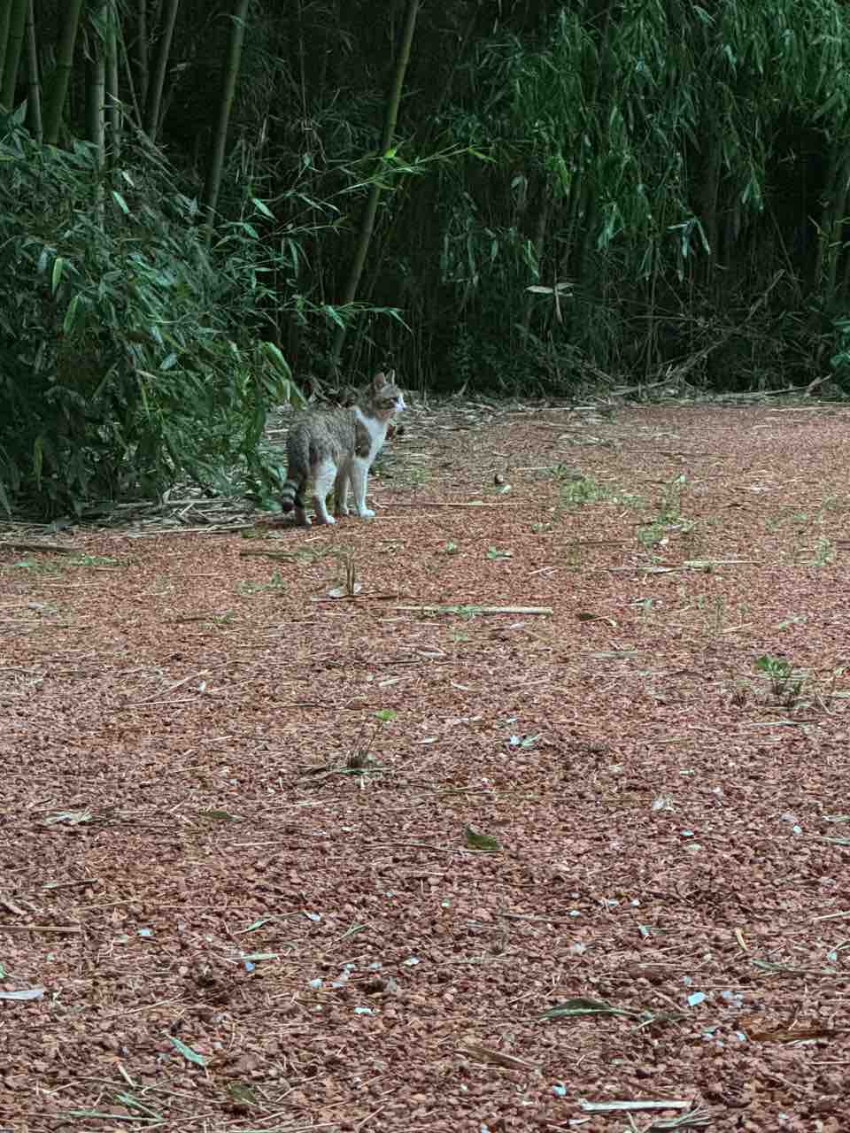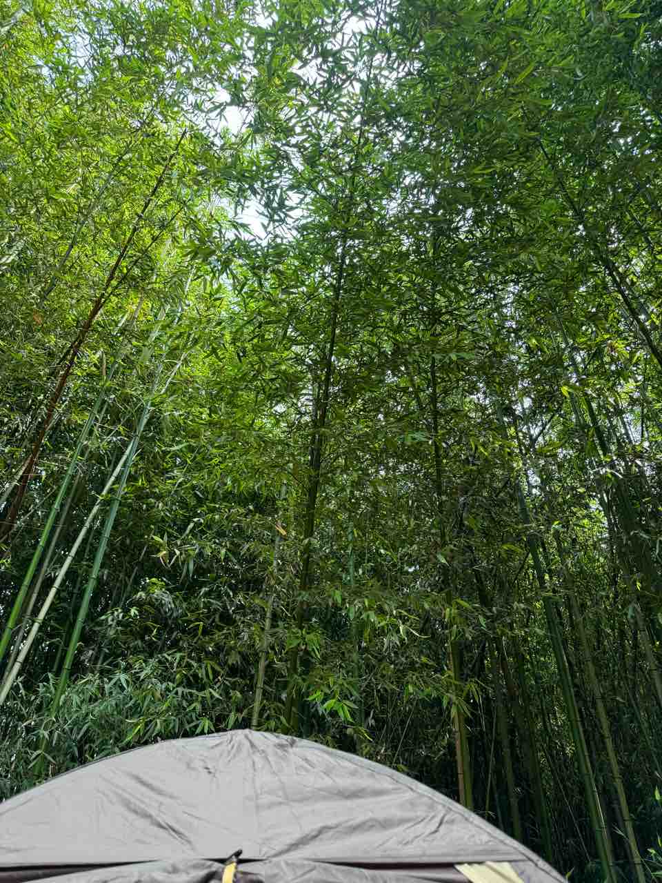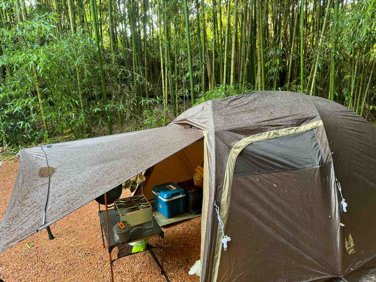 朝は4時頃に鳥達が鳴きまくってて目が覚めたんだけど、そのまましばらくテントでウツラウツラしてた。ポツポツと水がテントに当たる音がしてて、朝も雨なのかなと思ったんだが、外に出てみると降ってない。竹の葉から雫が落ちまくってた。そうかぁ……そうだよなぁ。竹の下にテント立てて雨が降ったらそりゃそうなるよなぁ……テントは全面ビッシャビシャ。