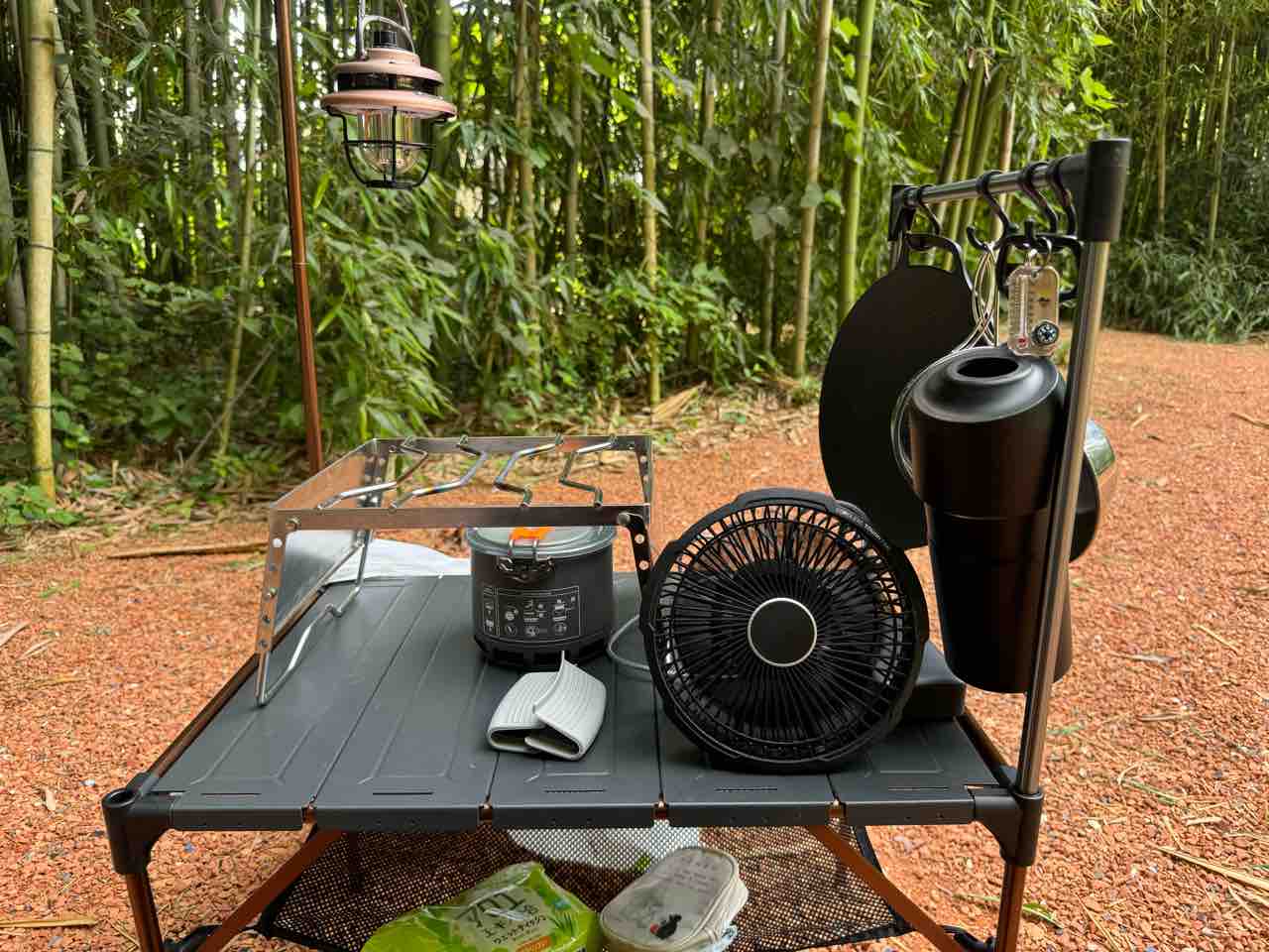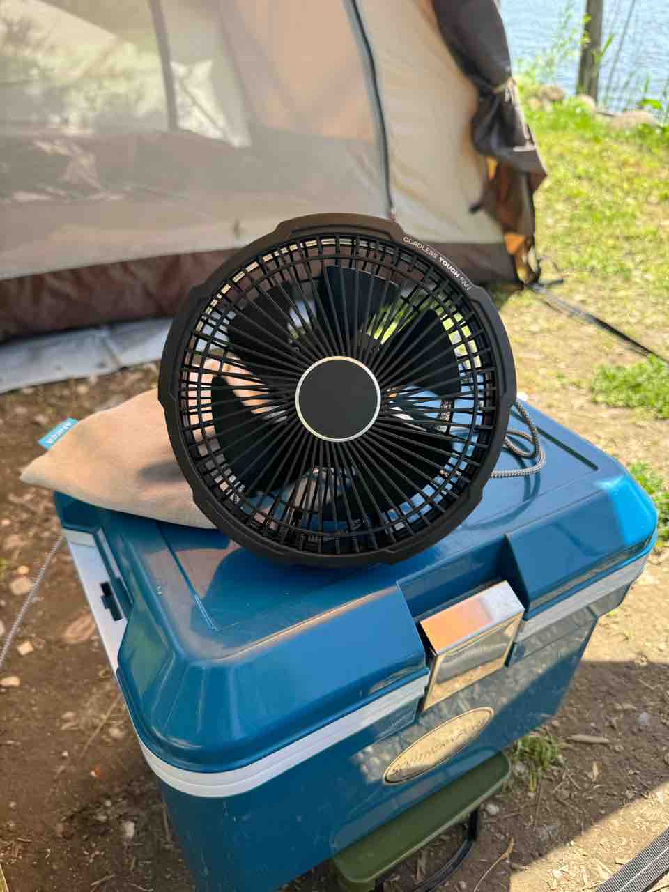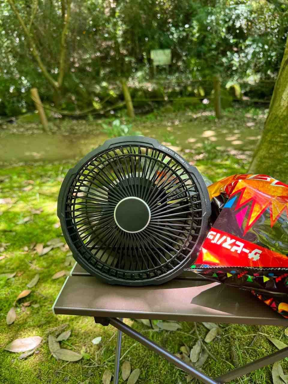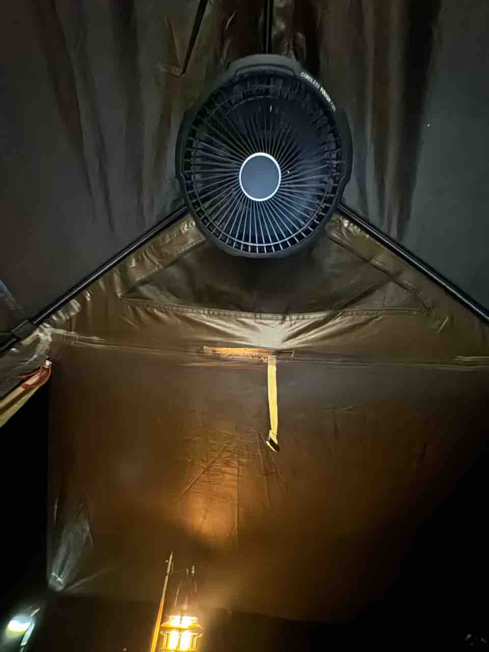 雨が降り出してからは扇風機をどこに置くか悩んでたんだけど、ふと見るとテントの上部のポールがある訳で、そこに引っかけたら良いのではと思ってやってみたら正解。