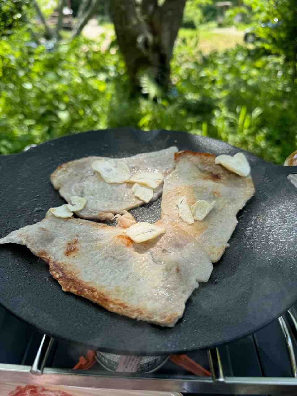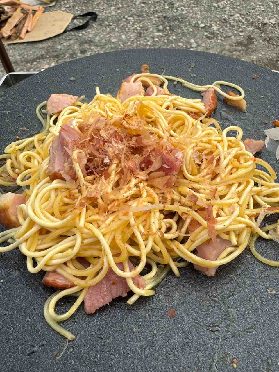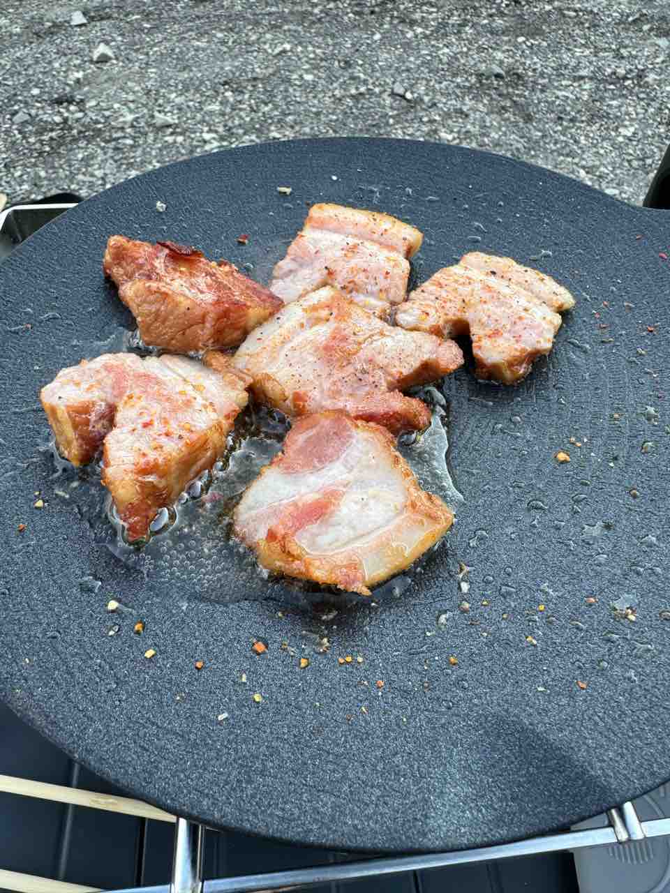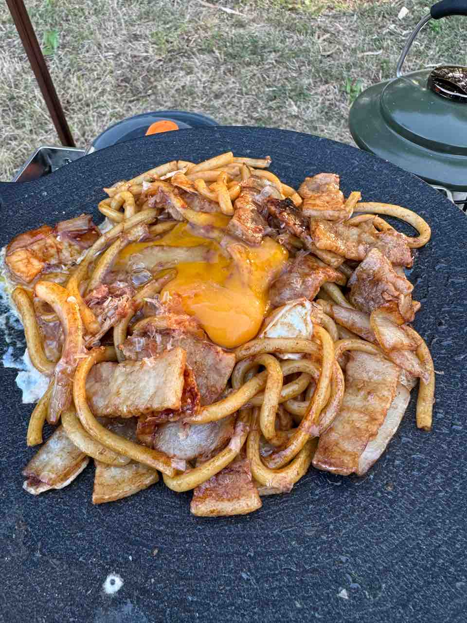 とはいえ、10時頃にブランチを食べたっきりなので腹も減る。今回は簡単に美味しく食べれる料理をしようと思って持って来てたが風が強くてバーナーが使えず諦めてたんだよね。でも風が収まって、これならいけそう!という事で作った。