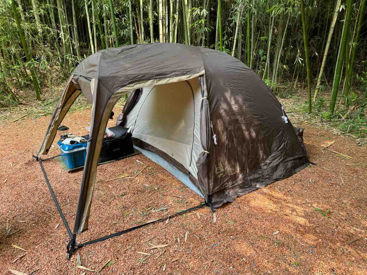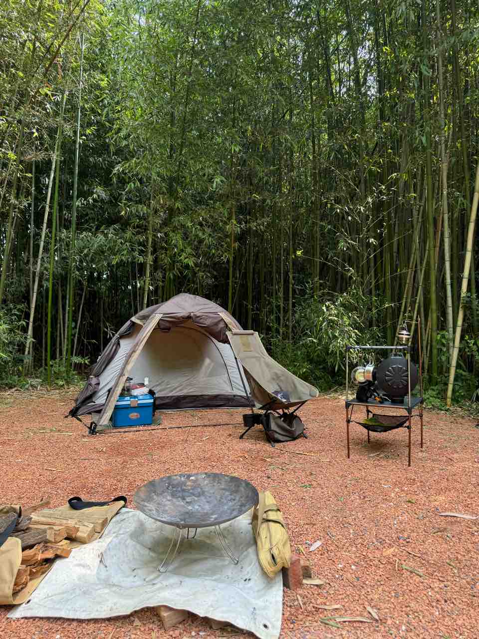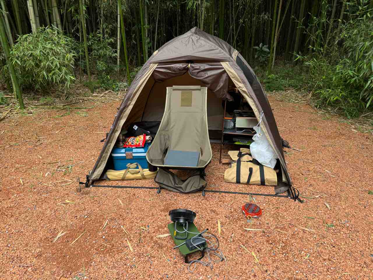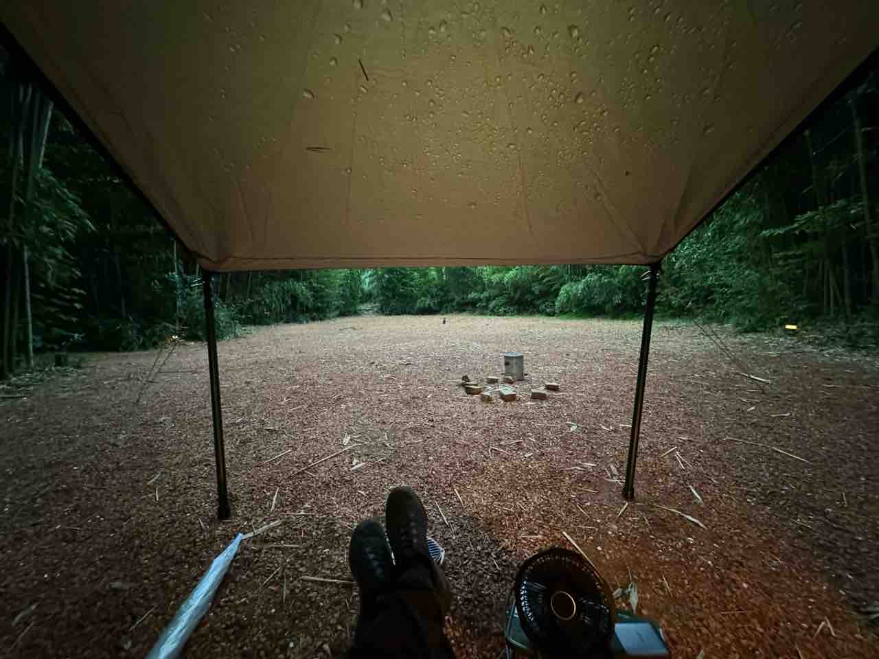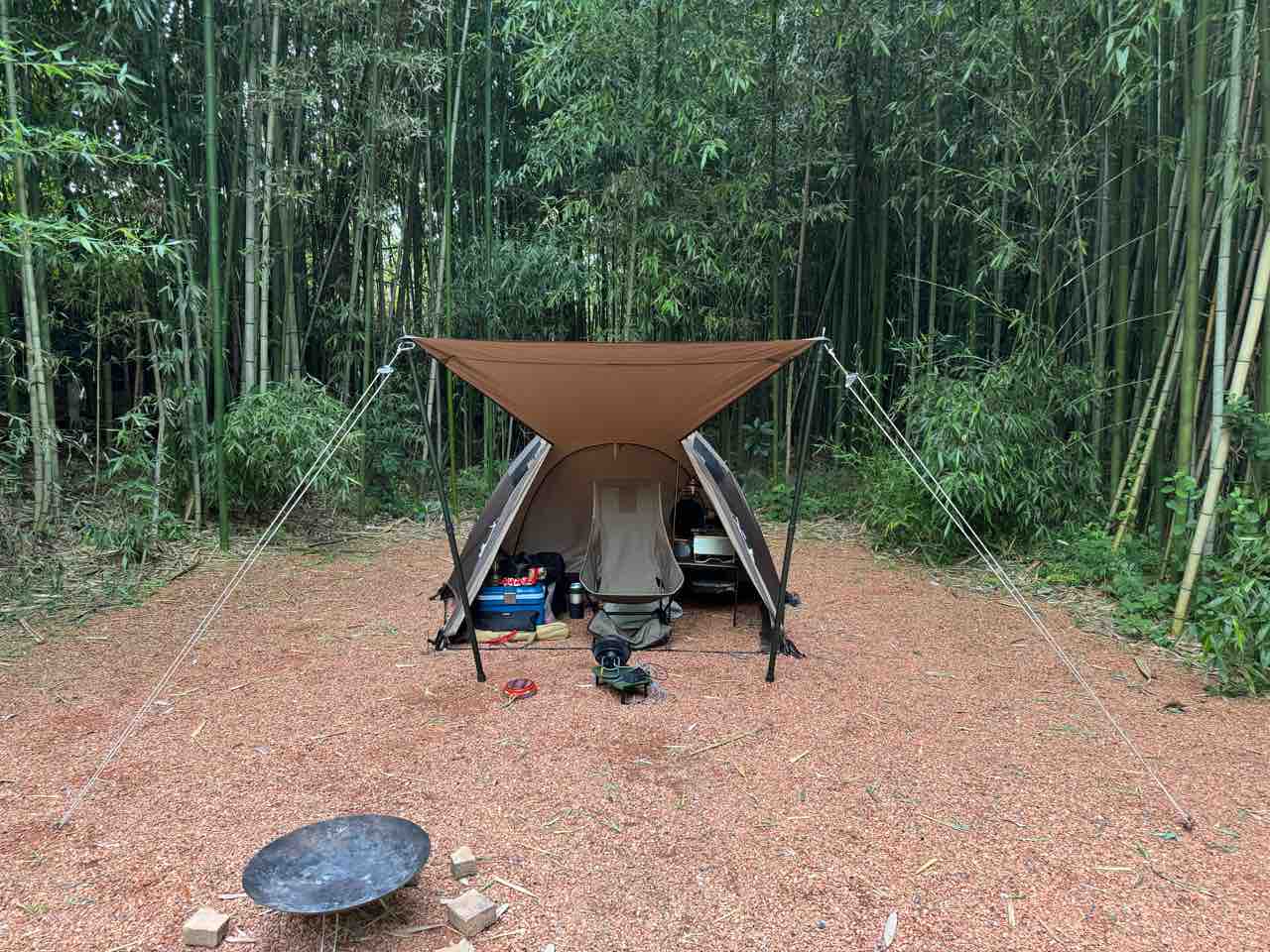 竹林に囲まれていて、横も後も竹でいっぱい。これが日を遮ってくれてるので、直射日光を浴びることは全く無かった。ただ、風もあまり無かったので、扇風機が無かったら辛かっただろうなぁ。夏のキャンプはやっぱり厳しいねぇ。