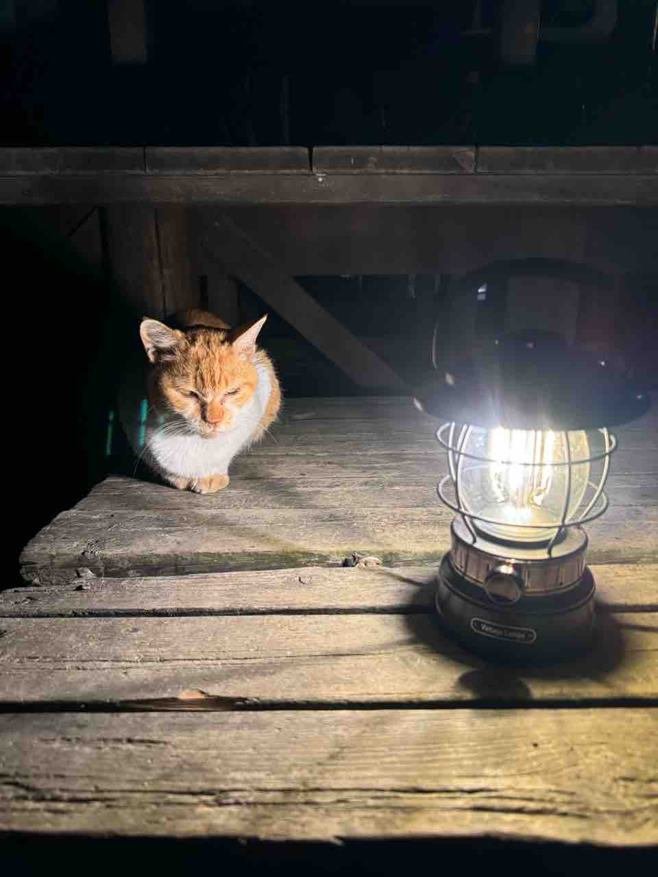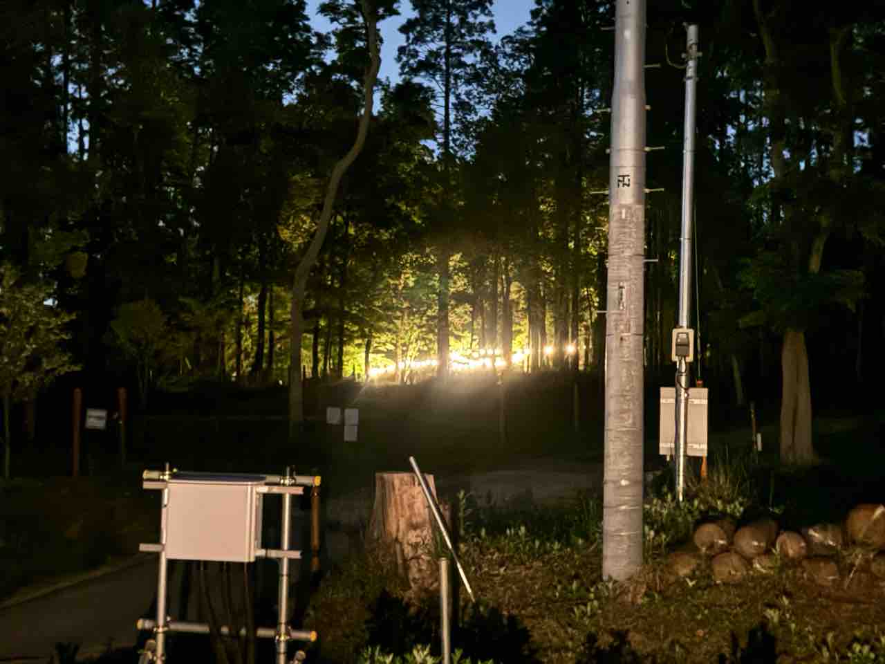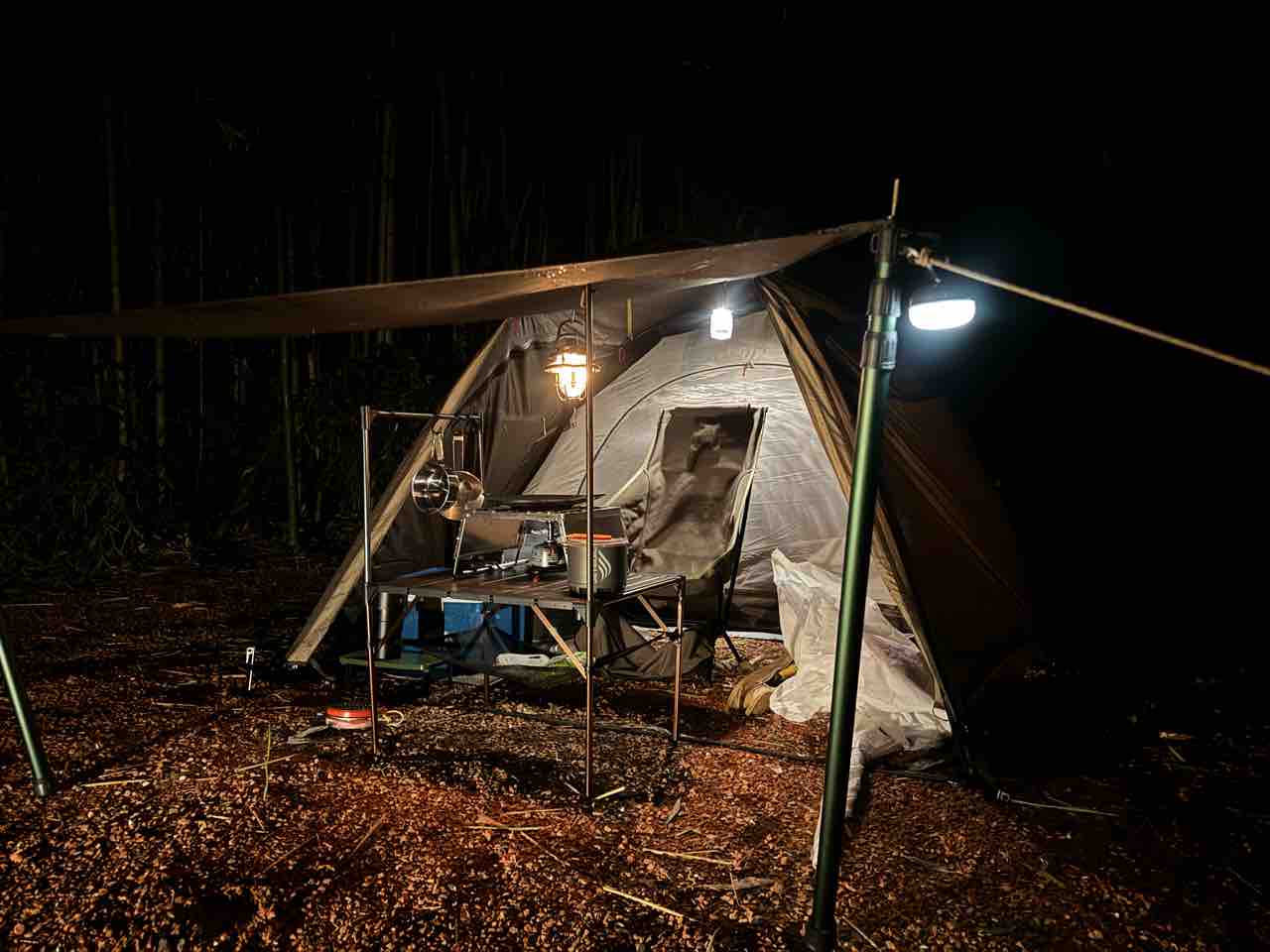 そんな夜のテントを外から見るとこんな感じ。雨も止んだんでね、ちょっと写真でも撮っておこうかと。ランタン4つ持ってて、画面に3つあるけれど、残り1つはトイレ行ったりする時に持ち歩く用にしてる。一番大きくて明るいから良いかなって。私しか居ないキャンプ場で、ここだけ光があるってのは個人的に良かったなぁ。
