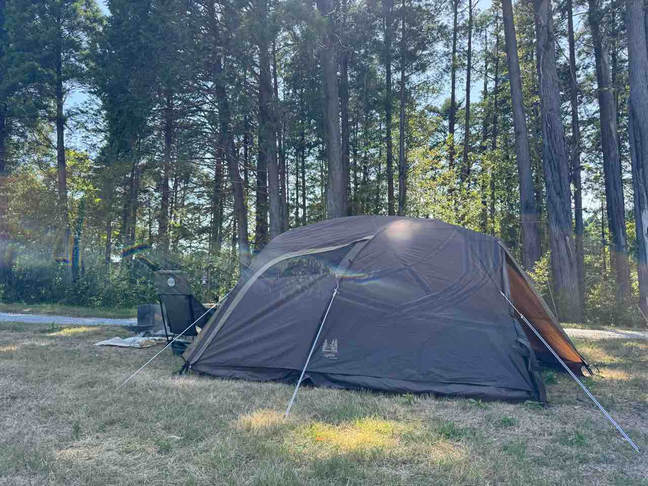 広い。かなり広い。樹に囲まれてるし、芝生だし、かなり贅沢なサイト! 息子と二人でやや引いた(笑)。ここに来る道中では雨が降っていて、かなりやばいかなと思ったんだけど、水捌けも良くて、これなら張れるということで息子と設営。