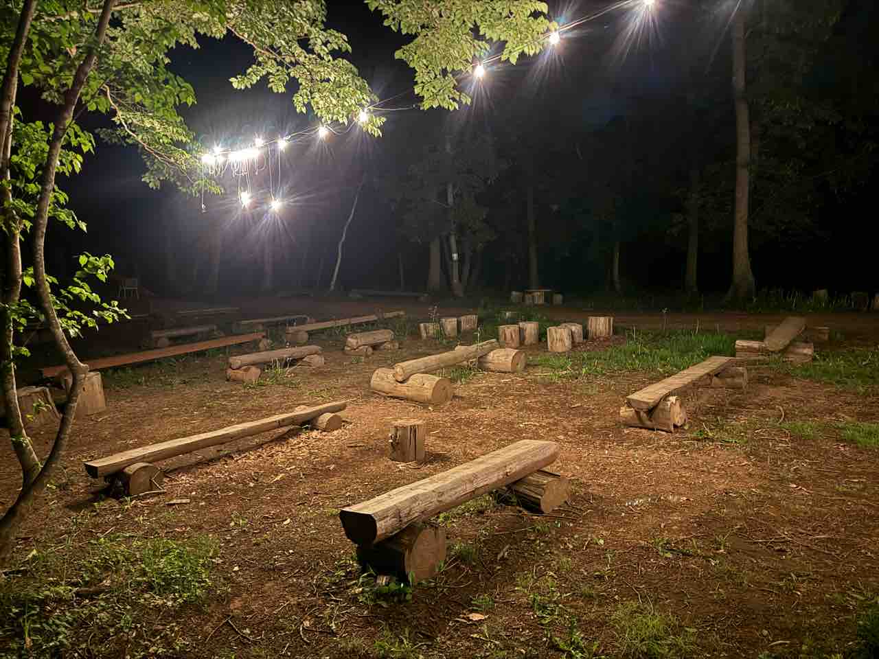 ちなみに、焚き火をする場所は決められていて、こういう風に石で囲まれてる。竹を背にこの囲まれた所でやってね、とのこと。そこに焚き火シートと焚火台をセッティングした。