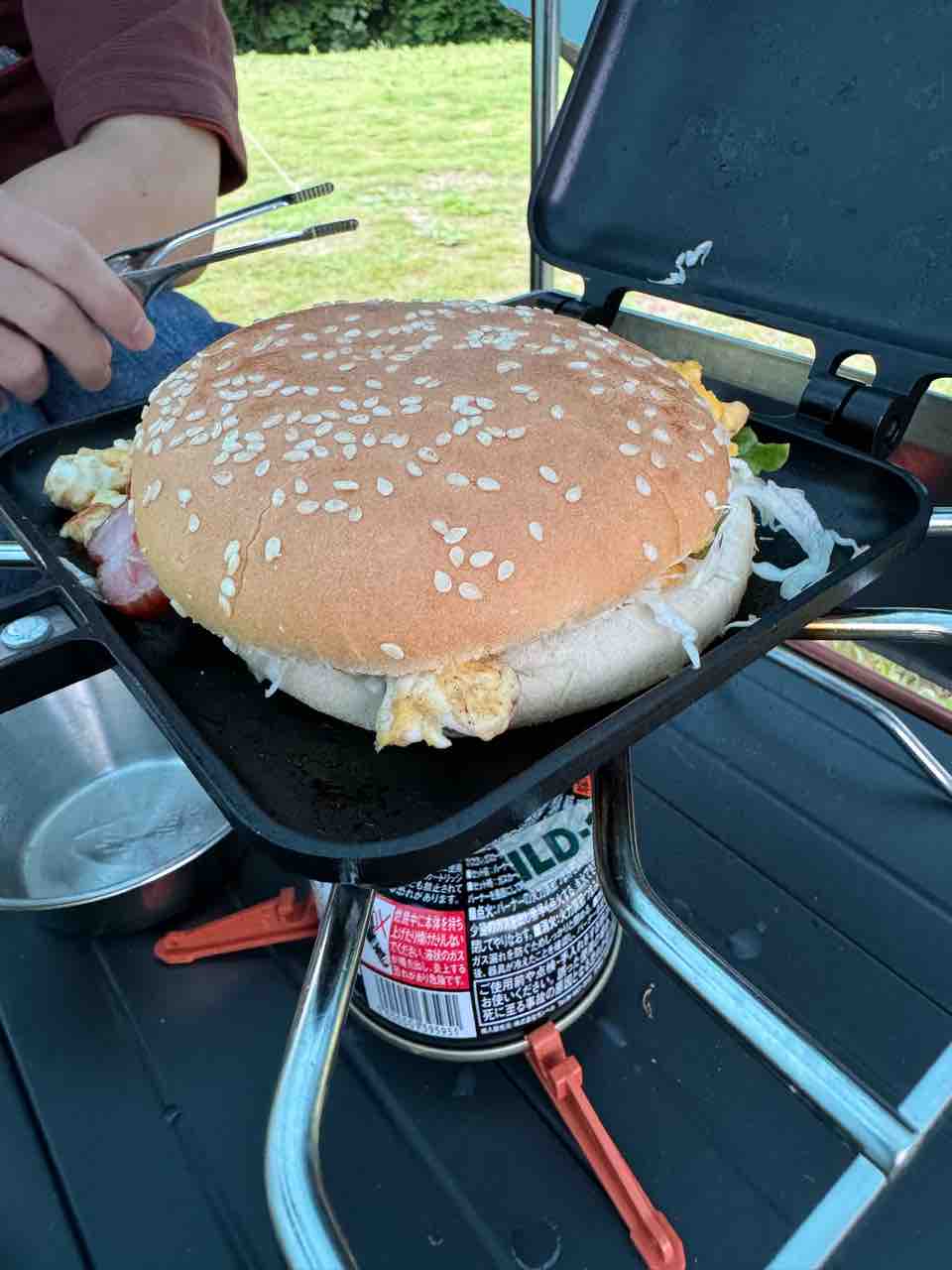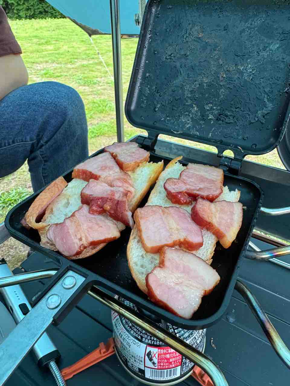 そんな中で息子がホットサンドメーカーで作ってくれた朝食。スクランブルエッグとベーコンを炒めた物にカットサラダも挟んで、それをホットサンドメーカーで挟んで焼いた物。入れすぎて溢れたけど美味かった。