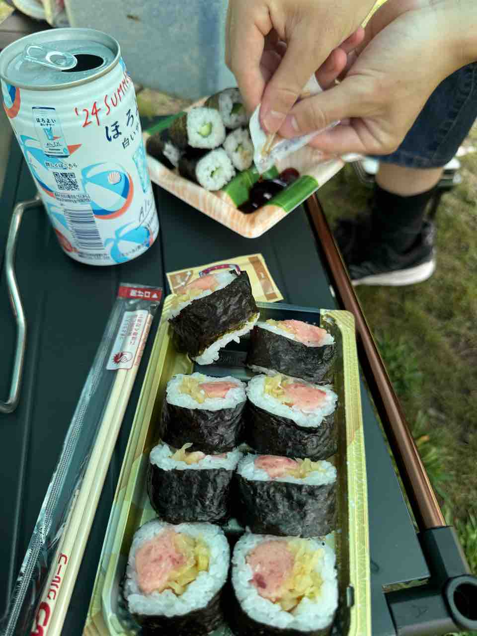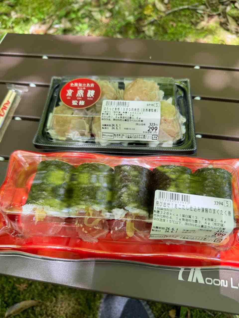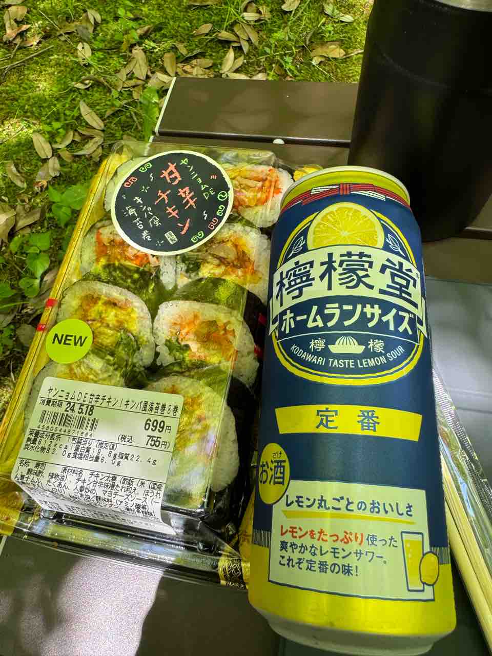 いつも昼には売って無くて、これまでのチェアリングでは一度も食べた事が無かったマグタクを買えたのは嬉しい。醤油もかけて食べつつ酒呑んで、良い感じ。いやぁ、もう私にとってチェアリング=酒だから、こういう美味しいつまみになる物を買って酒呑んでれば幸せだわな。
