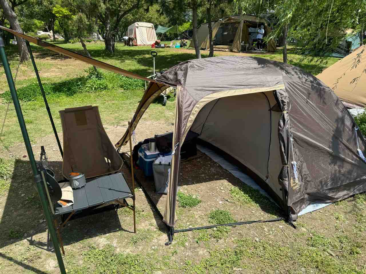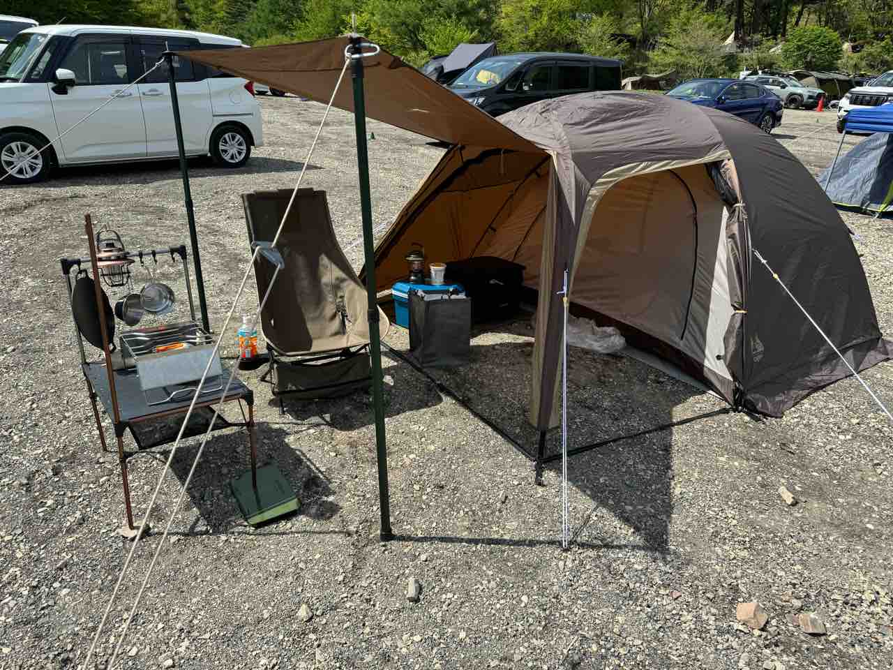 まずはタープを立てて、テントを二つ。親子なのにグルソロ(笑)。息子っても成人してる私より大きい体格してるし、同じテントで寝るってのは無いなぁ……暑いし狭いし。だから二つテントを立てて、これで良しと。