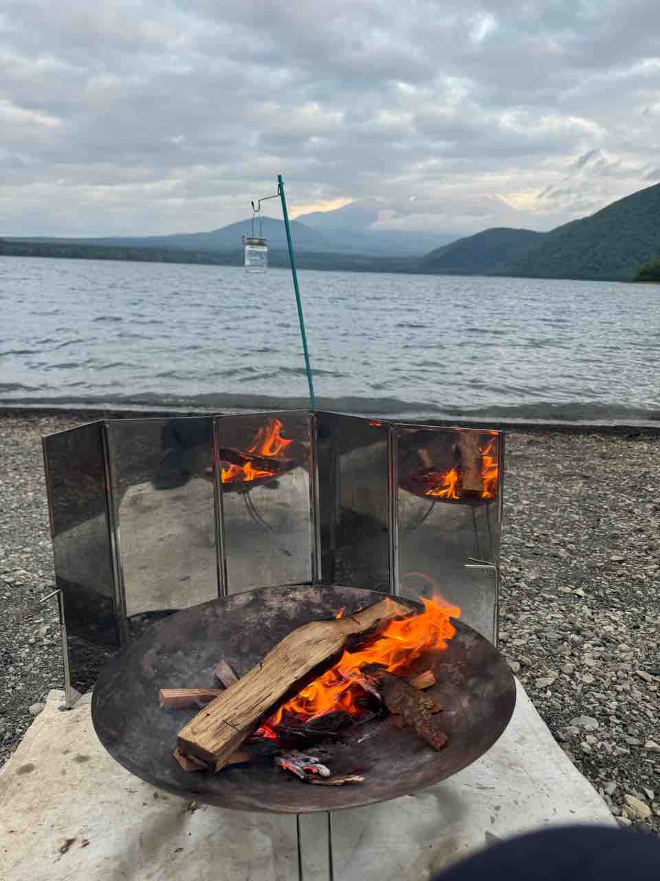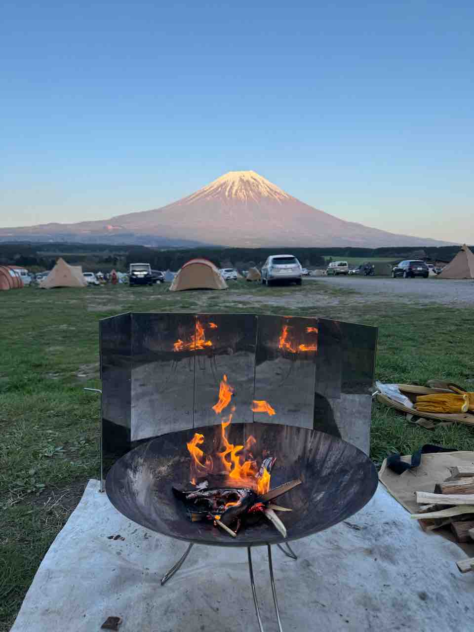 風速4m以上だと焚き火禁止で、この日は朝から焚き火禁止になっていたんだけど、風が弱まって遂に公式に焚き火禁止解除! となれば早速焚き火開始。見たかった光景の一つがこの焚き火と富士山。うわぁやっぱり綺麗~としみじみしながら酒を呑む。