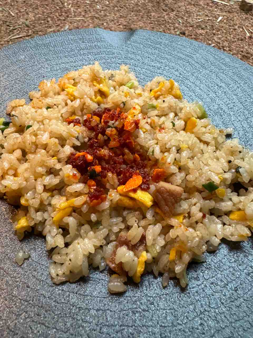 晩ご飯?になるかな。冷凍炒飯をマルチグリドルで炒めて、最後に食べるラー油をかけたもの。キムチ炒飯もそうだけど、私、辛めの炒飯が好きだからこれはとても美味かった。食べるラー油は瓶ごと持っていきたくなかったので、サランラップに必要量包んで持って来た……他に良い持って行き方が無かったので仕方無いし、どうにかなったからこれで良い(笑)。