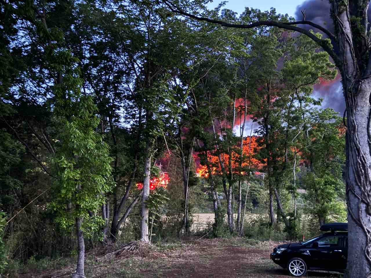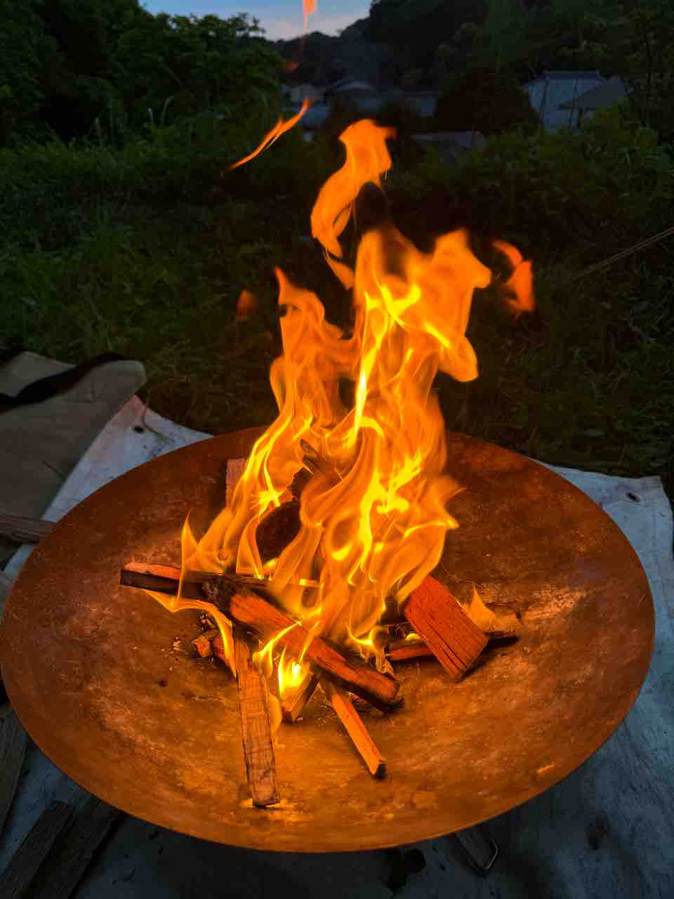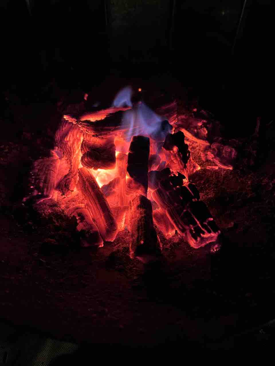 暗くなってきたので焚き火も。煙アレルギーあるから大丈夫かな?と思ったんだけど、風上キープで大丈夫。息子としてもやはりキャンプをやるなら焚き火はやってみたかったと。ただ、この燃えっぷりの良さの後は……雨が降ってきたんだよなぁ。もう焚火台も暑くて動かせないし、時々薪を足してやって火を絶やさないようにして、雨が止んだらまた親子で焚き火を楽しみつつ酒を呑むという。