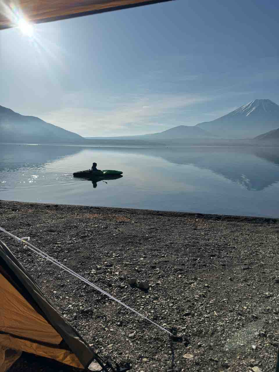 日の出が5時頃だったので早起きしてテントの外に出てみたら素敵な富士山。何て言うんだろう……夜が明ける!という期待感。そりゃ朝だから夜は明けるんだけど、富士山の背後から光が……という所が良かったんだよね。