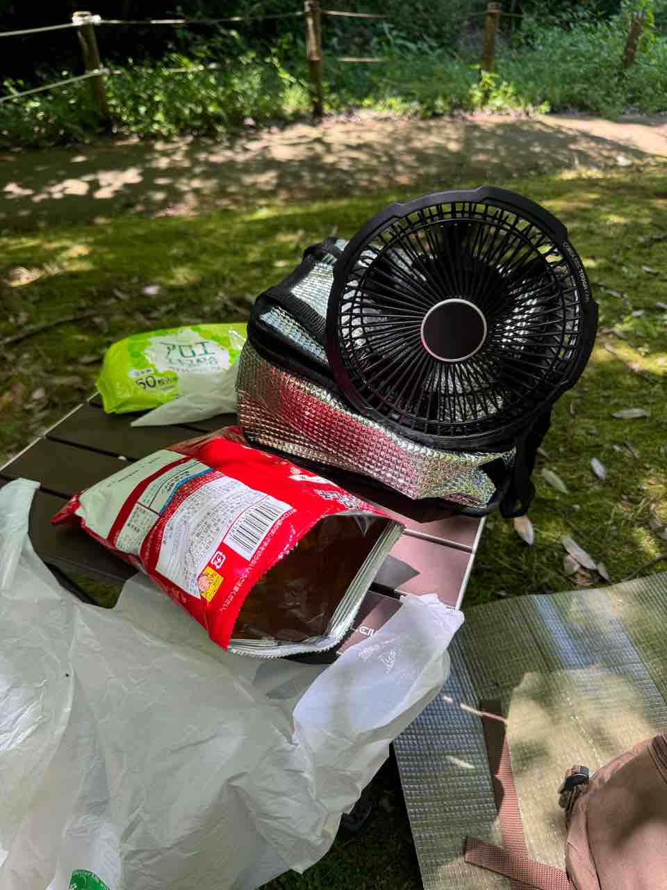 流石に木陰でも暑いので扇風機は持って来ている。風量MAXにして風を浴びつつ酒呑んでマッタリ……