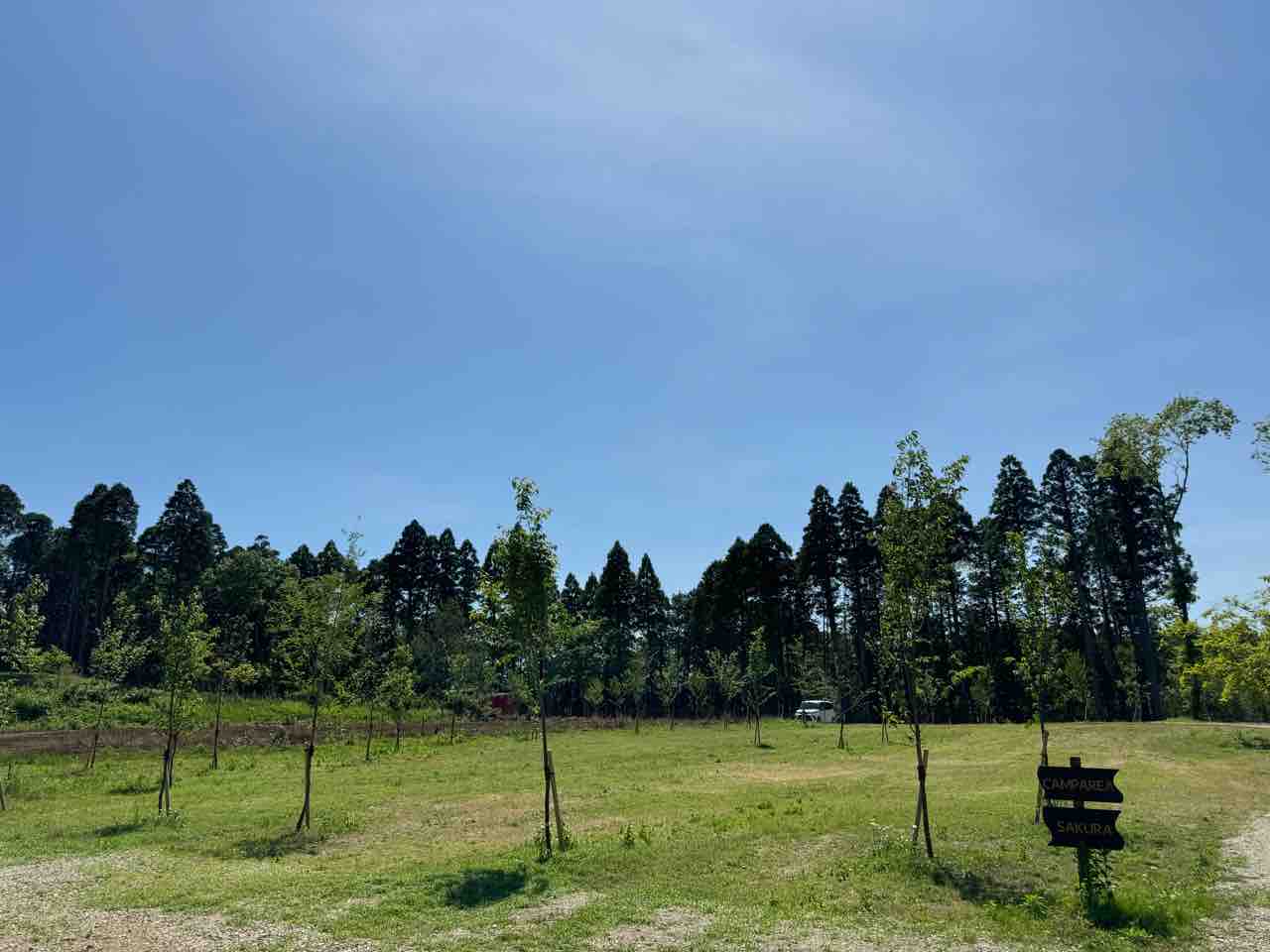 サイトへの入り口から見ると奥の方にそっとテントがあるのが分かる。あれ、私。今回は私しかいないからテントを間違える心配は無いけど、なんとなくこの広い中に自分だけって写真を撮っておきたかった(笑)。ということで設営は終わりかな……