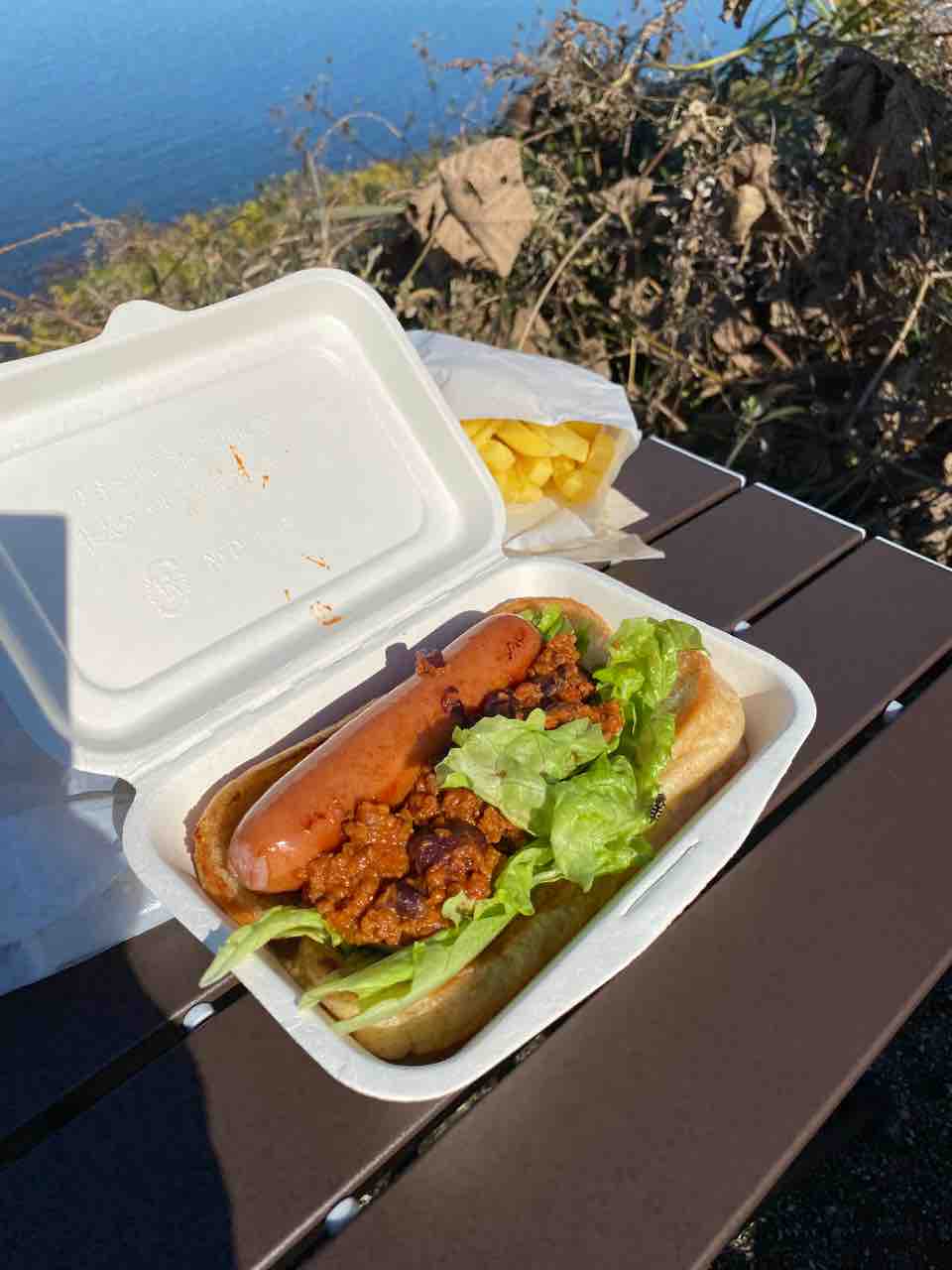 黒焼きそばもグラバーガーも惹かれたんだが、スパイシードッグがやたら美味そうでそれを選んでしまった(笑)。ついでにポテトもつけて、飲み物もセットにしようかと思ったけど、値段的になぁと思いポテトセットまで。飲み物は自販機でお茶買って行った。全部現地調達でいけるのが良いな。
