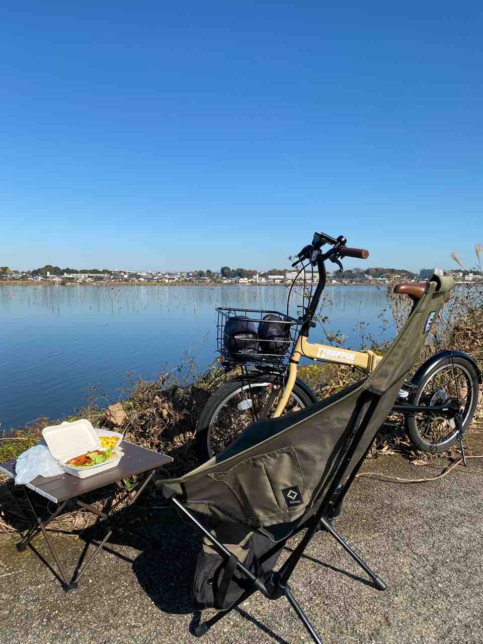 自転車のカゴに食料を入れて、手賀沼に沿って移動開始。自転車用に道があるからガチ勢に抜かれる時にヒヤッとする以外はまったり。歩行者用と自転車用の道があるんだけど、時々観賞用なのか沼に近い側に少しだけ違う道があったりする。そこが丁度見易かったので、そこに自転車を停めて、椅子と机をセットした。