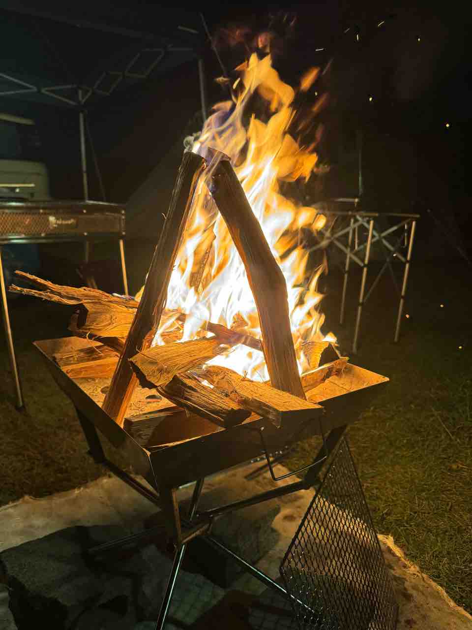 焚火もやって。一人でしみじみ焚火見てるのも楽しいけど、囲むのも楽しいね。ソロキャンで凄く楽しんでいて、今後も続けていくつもりだけど、グルキャンも楽しいなって。