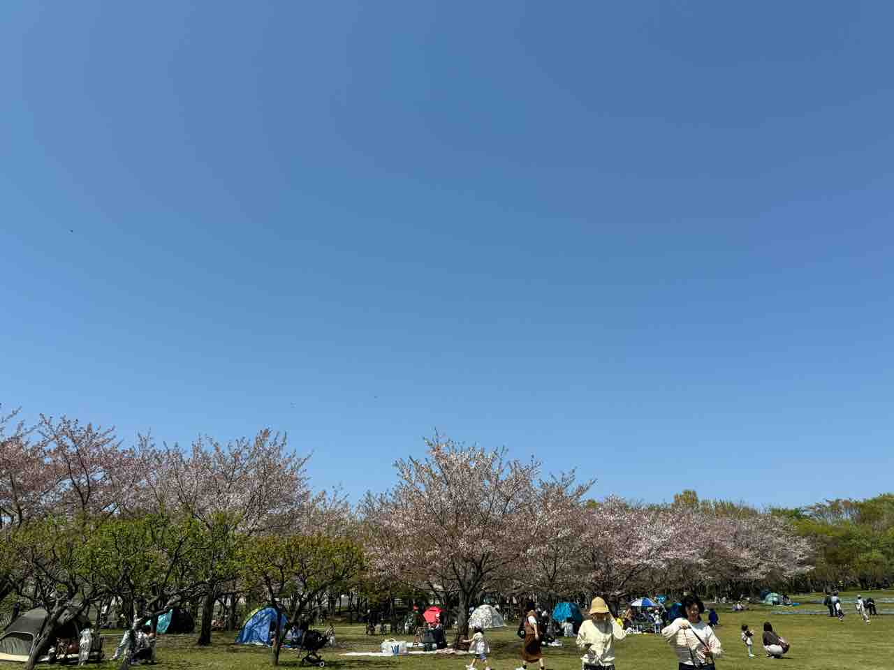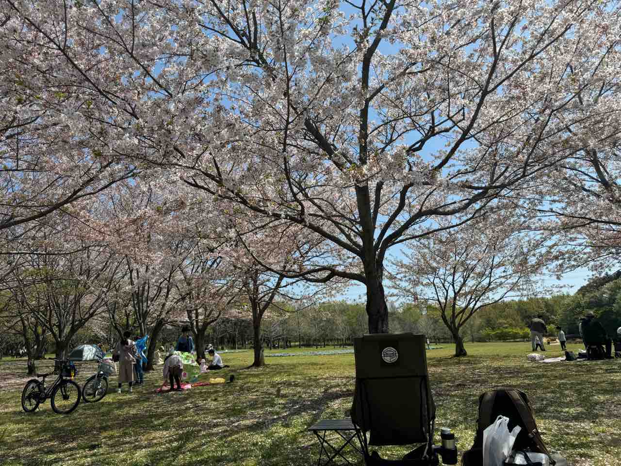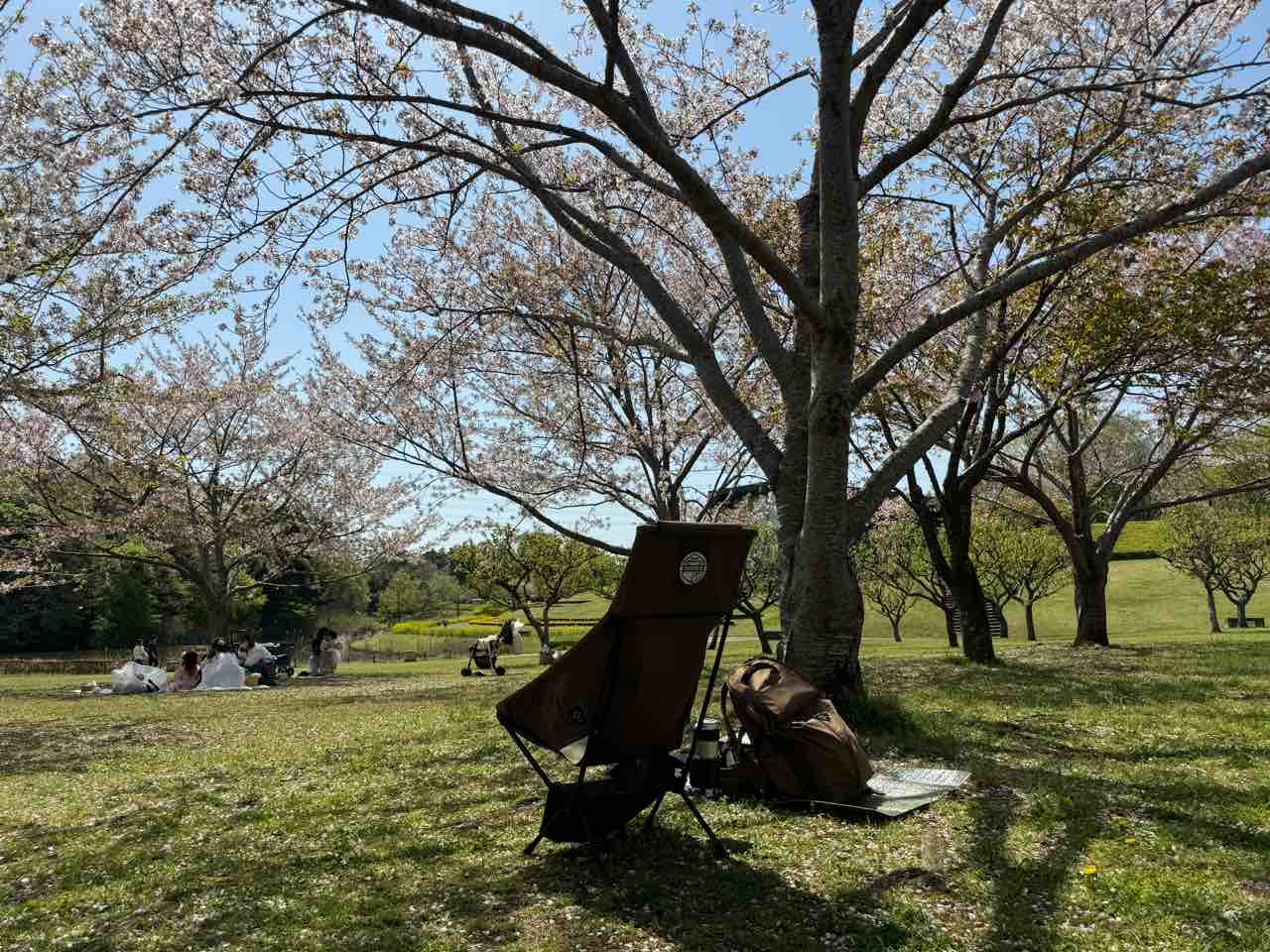 トイレ行って戻ってくる時に見たら、一画に桜が何本かあって、そしてその上に青空。なんて綺麗なんだろうって。写真だと桜のインパクト落ちてるけど、歩いて帰ってくる時はそこだけピンクで綺麗だなぁって思ったんだよね。その中に私のチェアもあって、そこで花見をしてる訳で。