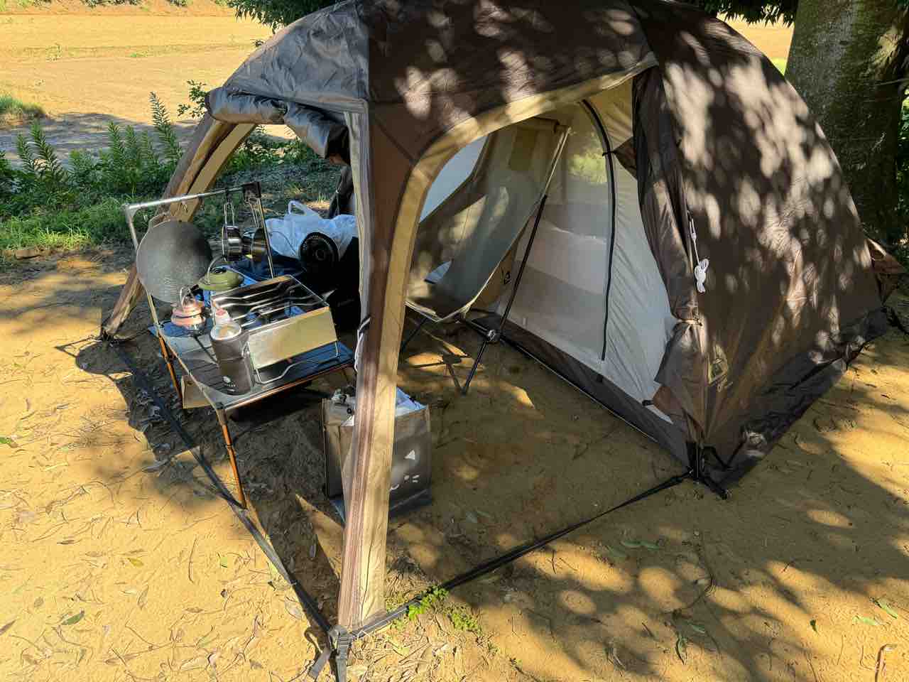 火が消えたのを見つつ、寝る準備へ。焚火台以外の荷物は全部前室に入れて、私もそのままテントに入っておやすみなさい……