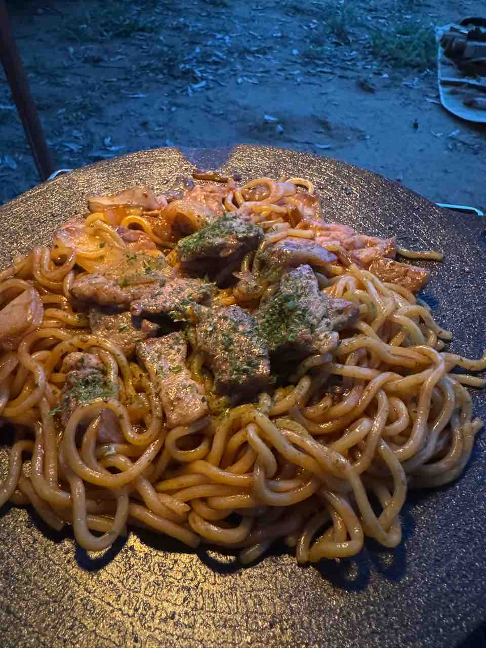 そして残りの肉は、鋏で切って更に焼いて、そこに冷凍カット玉ねぎをぶち込んで炒め、そこに焼きそばの麺を入れて水を入れてほぐしつつ混ぜる。最後にソースと青のりかけて焼きそばのできあがり。これまた、冷めないまま食べれて良かった。UFOも作るタイプがあったんだよねぇ。慣れた味の安心感は素晴らしい。