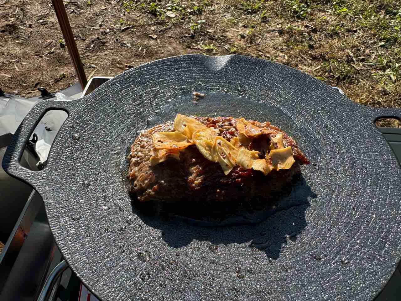 のんびり呑みつつ牛久沼を眺めたり、偶然会った知り合いと話したりしてたら少し小腹が空いてきたので、ヒキニクソノママヤイターノを作った。前回は牛挽肉で作ったんだけど、今回はスーパーに売ってなくて合挽肉。豚肉が入る分、しっかり焼かないとまずいかもと思いつつ、油が凄くて揚げ物みたいになるんじゃないかと不安になったり(笑)。でも、バッチリできた。油を吸ったニンニクもまた良し。焼肉のタレにつけて食べたら、大体美味いんじゃないかろうか、肉は(笑)。